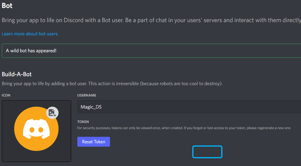 사용할 봇의 이름을 입력하고 create 버튼을 눌러줍니다.