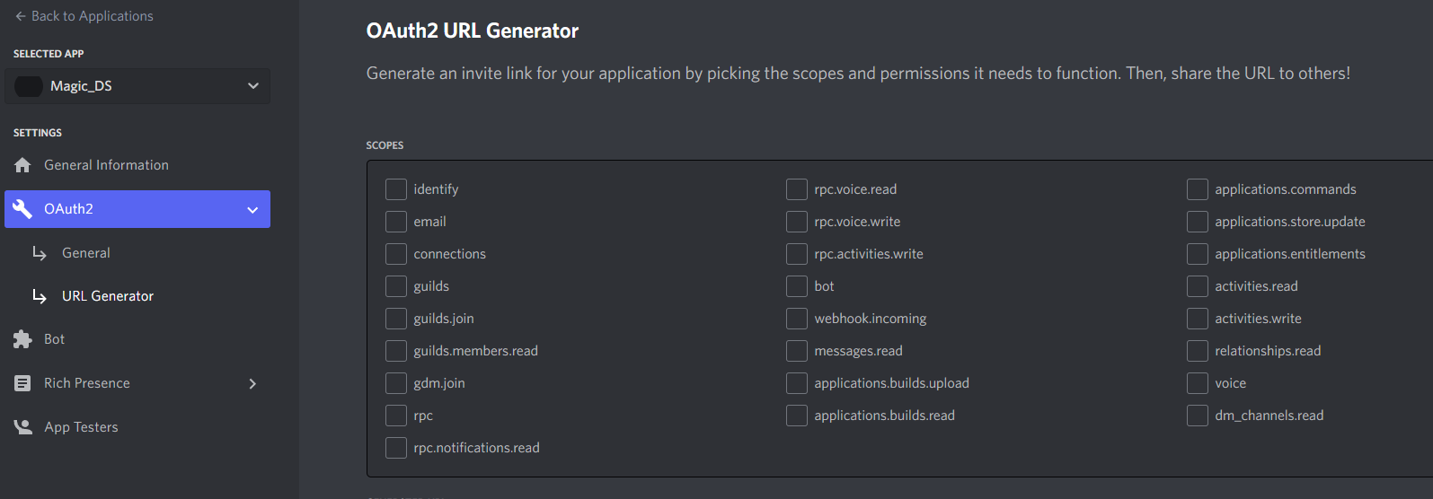 OAuth2 URL Generator 에서 bot을 클릭해줍니다.