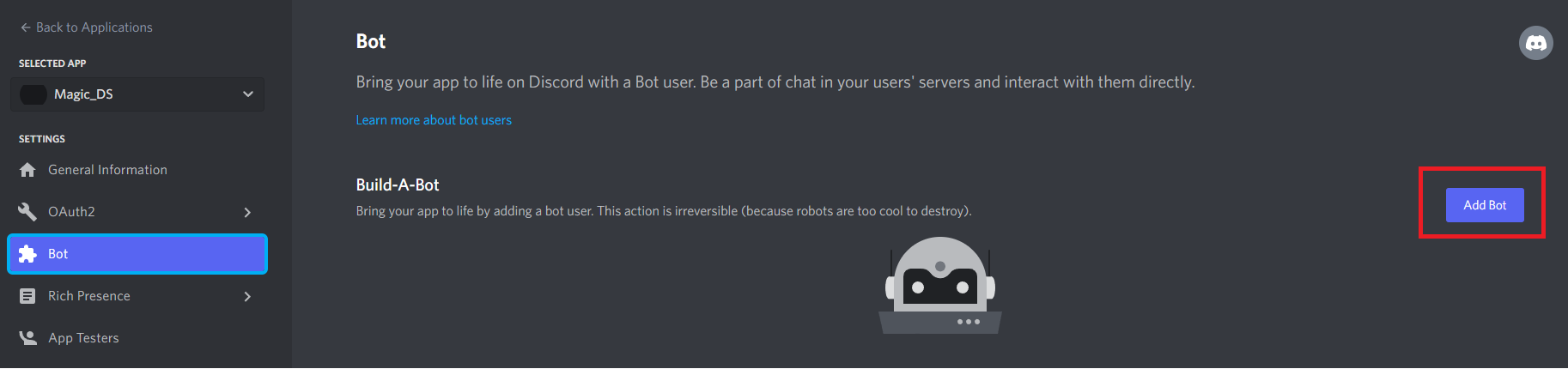 서버에서 좌측 'Bot'을 클릭하고 Add bot을 클릭해서 추가해줍니다.